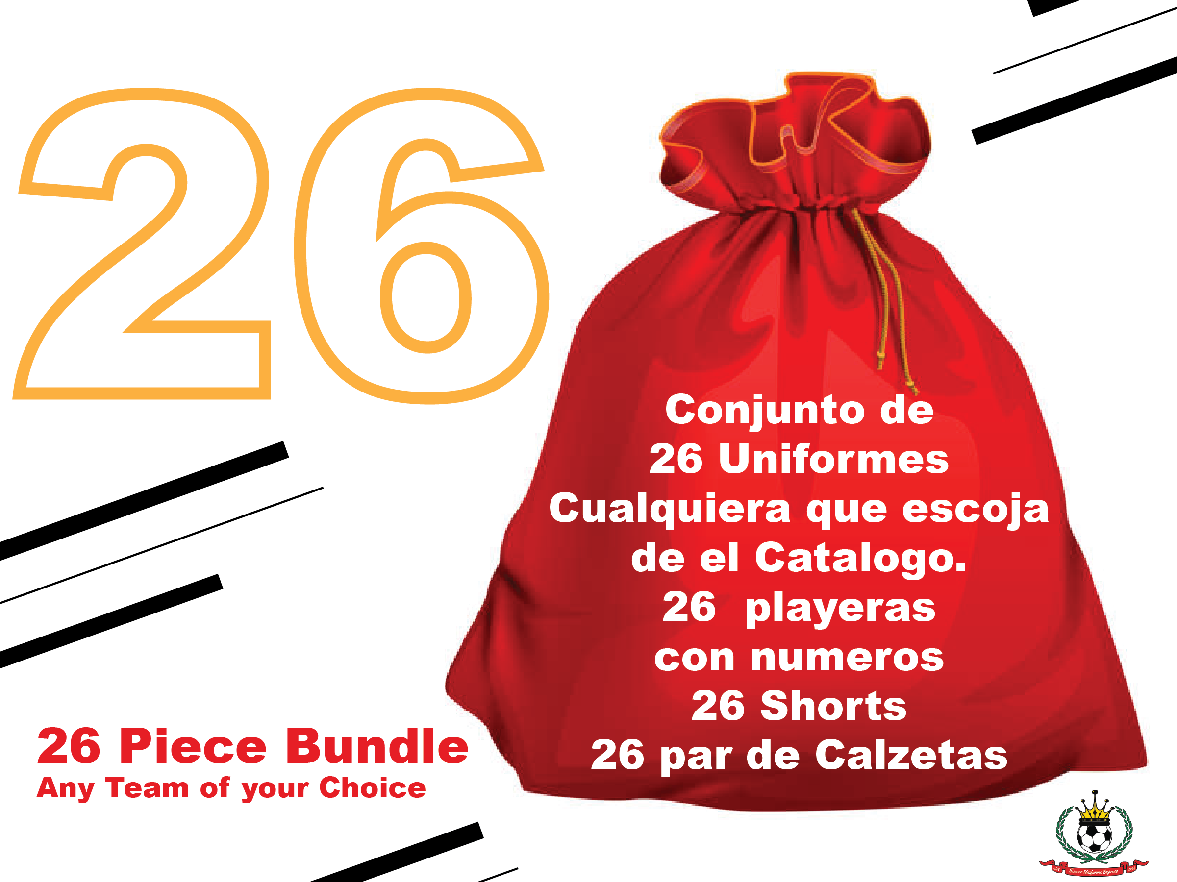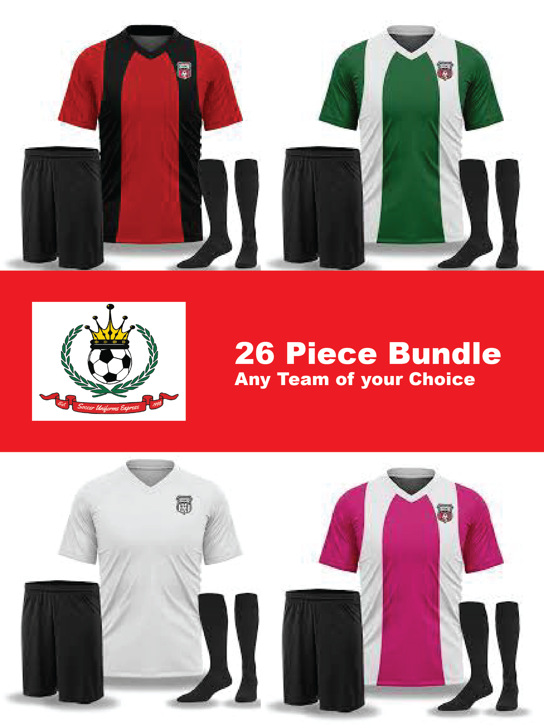 Bundle of 26 Includes: Any Team of your Choice 26 Jersey w/number 26 Shorts 26 Pairs of Socks (any color)